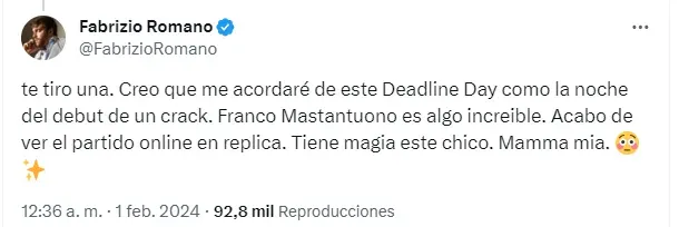 Dentro de todos estos elogios, uno de los que más llamó la atención fue el de Fabrizio Romano quién aseguró ver el partido y se notó gratamente sorprendido con Mastantuono: “Creo que me acordaré de este Deadline Day como la noche del debut de un crack”, comenzó tuiteando.