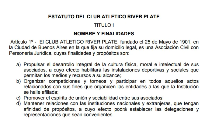 “El Club Atlético River, fundado el 25 de Mayo de 1901, en la Ciudad de Buenos Aires en la que fija su domicilio legal, es una Asociación Civil con Personería Jurídica, cuyas finalidades y propósitos son: