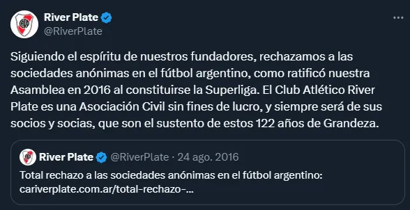 Tal como marca el artículo 1° del estatuto de la institución (“…es una Asociación Civil con Personería Jurídica…”), River rechaza terminantemente el desembarco de las SAD en el fútbol argentino y lo volvió a dejar en claro en el comunicado que publicó en sus redes sociales el pasado 11 de noviembre: “Siguiendo el espíritu de nuestros fundadores, rechazamos a las sociedades anónimas en el fútbol argentino, como ratificó nuestra Asamblea en 2016 al constituirse la Superliga. El Club Atlético River Plate es una Asociación Civil sin fines de lucro, y siempre será de sus socios y socias, que son el sustento de estos 122 años de Grandeza“.