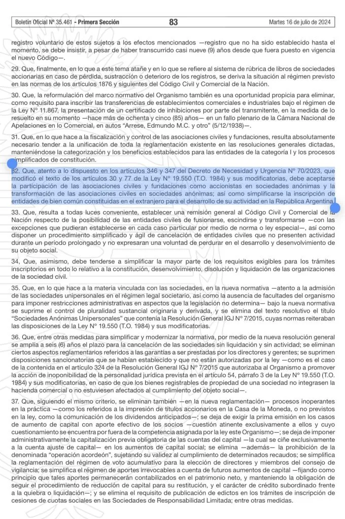 La Inspección General de Justicia publicó este martes la resolución oficial que entrará en vigencia a partir del 1° de noviembre, que da lugar al avance de las Sociedades Anónimas Deportivas. El punto 32 del mencionado escrito hace mención a los artículos 346 y 347 del Decreto de Necesidad y Urgencia 70/2023 y enuncia que “debe aceptarse la transformación de las asociaciones civiles en sociedades anónimas”.