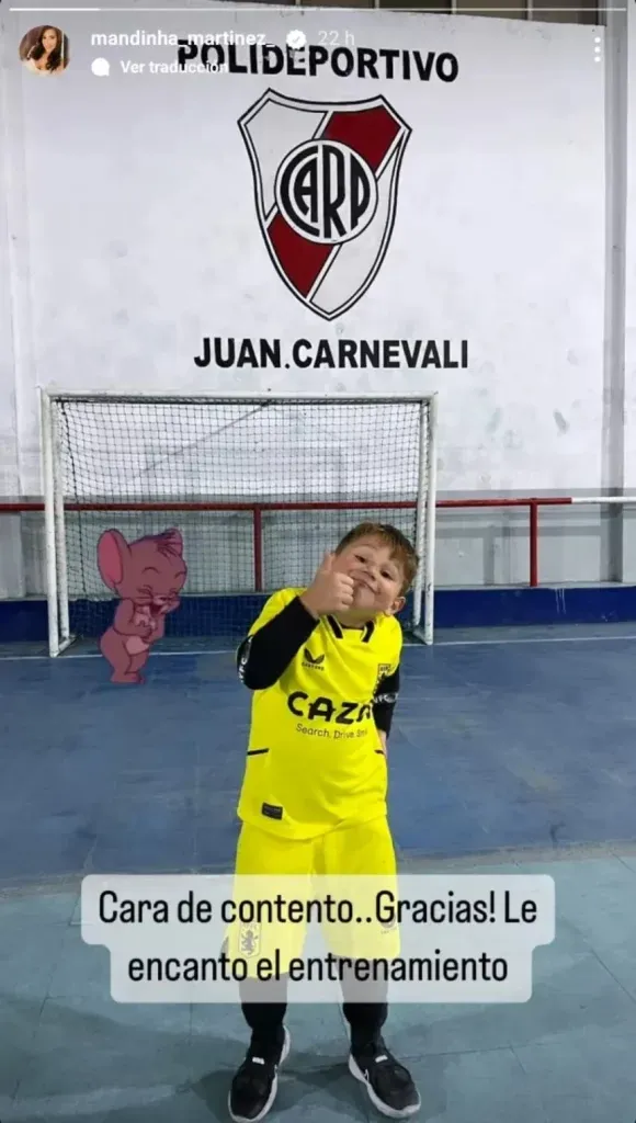 Más allá de aquel gesto del “Dibu” hacia el estadio más grande de Sudamérica, en las últimas horas se viralizó una foto que volvió a llamar la atención dentro del Mundo River. Es que Mandinha Martínez, esposa del arquero de la Selección Argentina, posteó una foto de Santi, su hijo mayor, entrenando en una cancha de baby fútbol con un escudo gigantesco del Más Grande. “Cara de contento. ¡Gracias! Le encantó el entrenamiento”, publicó la mamá del pequeño, que posó para la imagen con la rompa de arquero.