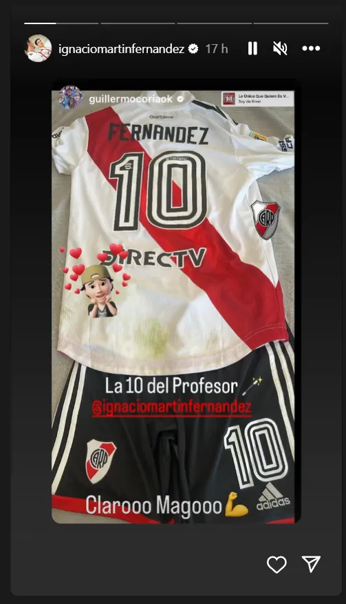 Nacho Fernández -de gran rendimiento ante el Halcón- le regaló al Mago su camiseta y su short. Coria utilizó su cuenta de Instagram para agradecer el gesto y acompañado de una foto escribió: “La 10 del profesor”. Nacho le respondió: “Clarooo Magooo”. Un cruce de talentos impresionantes -cada uno en su deporte- bien riverplatense.