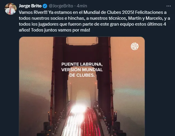 “Vamos River!!! Ya estamos en el Mundial de Clubes 2025! Felicitaciones a todos nuestros socios e hinchas, a nuestros técnicos, Martín y Marcelo, y a todos los jugadores que fueron parte de este gran equipo estos últimos 4 años! Todos juntos vamos por más!“, escribió el dirigente.