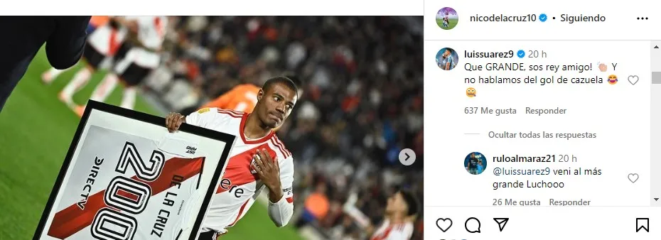 En este caso Suárez aprovechó el último posteo que subió De La Cruz a su cuenta de Instagram, donde contaba sus sensaciones luego de la goleada 5-1 frente a Barracas Central, para bromearlo un poco en referencia a su gran gol que le dio la ventaja parcial a River en el partido. “Que GRANDE, sos rey amigo! Y no hablamos del gol de cazuela”, comentó Luis en la publicación entre emojis de risa.