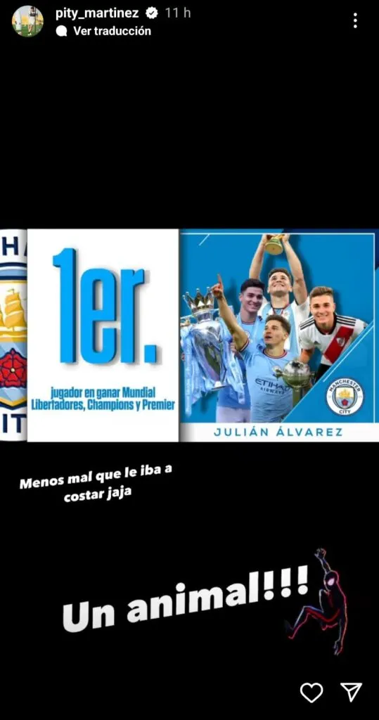 “Menos mal que le iba a costar jaja. ¡¡¡Un animal!!!”, fueron las palabras del zurdo que juega en Arabia Saudita y sigue en pleno proceso de recuperación luego de una nueva rotura de ligamentos en una de sus rodillas. Y acompañado al mensaje en sus historias de Instagram aparece una imagen de Julián levantando títulos con las camisetas de River, Argentina y el City. ¡Grande, Pity!