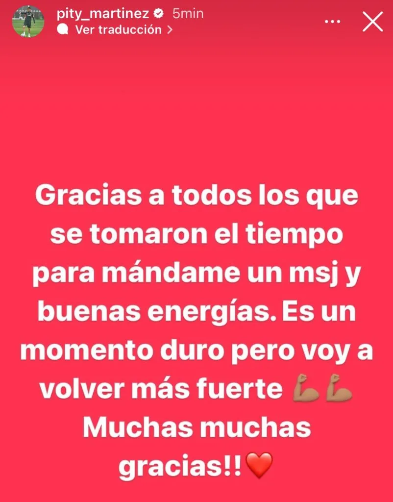 “Gracias a todos los que se tomaron un tiempo para mandarme un mensaje y buenas energías. Es un momento duro pero voy a volver mucho más fuerte. Muchas muchas gracias“, escribió el Pity en su cuenta de Instagram. Estaba teniendo una gran pretemporada y esta lesión lo obliga a frenar nuevamente.