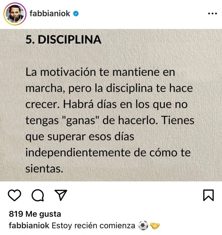 “La motivación te mantiene en marcha, pero la disciplina te hace crecer. Habrá días en los que no tendrás ganas de hacerlo, tienes que superarlos independientemente de cómo te sientas“, publicó el ex futbolista en sus redes sociales.