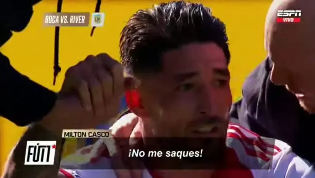 Milton Casco estaba visiblemente mareado y caminaba con algo de dificultad. Sin embargo, tuvo un rapto de locura y le hizo un pedido increíble al cuerpo técnico: “No me saques”, expresó el lateral millonario mientras era asistido por los médicos de River. El héroe de Madrid no quería abandonar el campo de juego por nada del mundo, pero ante el peligro que significó el fuerte golpe, no le quedó otra que ser reemplazado.