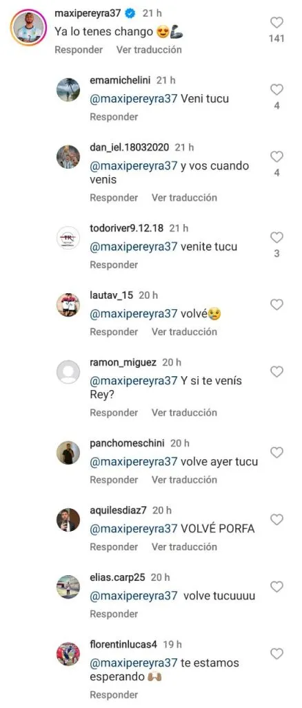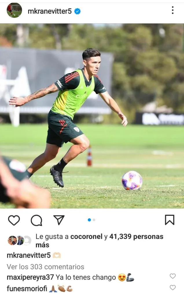 En los últimos días se lo pudo ver a Matías Kranevitter entrenando con pelota normalmente y se estima que en unas dos semanas podría volver a las canchas tras su dura lesión que sufrió en el amistoso ante Unión La Calera el pasado 22 de diciembre. El Colo compartió una foto entrenando y Roberto Pereyra le comentó en código tucumano: “Ya lo tenés chango”. Ese comentario se llenó de pedidos de hinchas de River para que regrese al club.