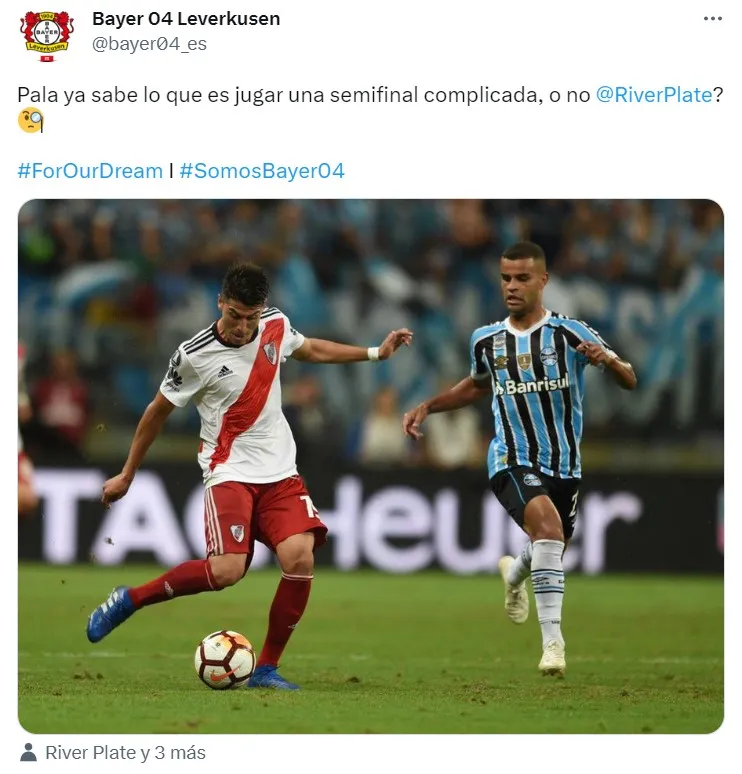 Justamente el equipo del Tucu Palacios tuvo un guiño en las redes. Bayer Leverkusen utilizó su cuenta de Twitter en español y posteó una foto de Exequiel Palacios en el duelo ante Gremio en Porto Alegre por la revancha de la semifinal de la Copa Libertadores y escribió: “Pala ya sabe lo que es jugar una semifinal complicada, o no River Plate?”. La realidad es que Exequiel Palacios jugó un partido impresionante ante Gremio en uno de los partidos más recordados de los últimos años.