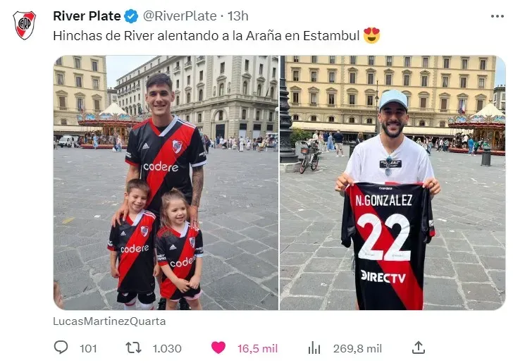 Lucas Martínez Quarta y Nicolás González estuvieron presentes en Estambul para presenciar la final de la Champions League. Cabe destacar que ambos son fanáticos confesos de River y el club les regaló una camiseta a cada uno con sus nombres y el número que utilizan en sus clubes. El Chino Martínez Quarta estuvo con sus dos hijos, que también aman al club.