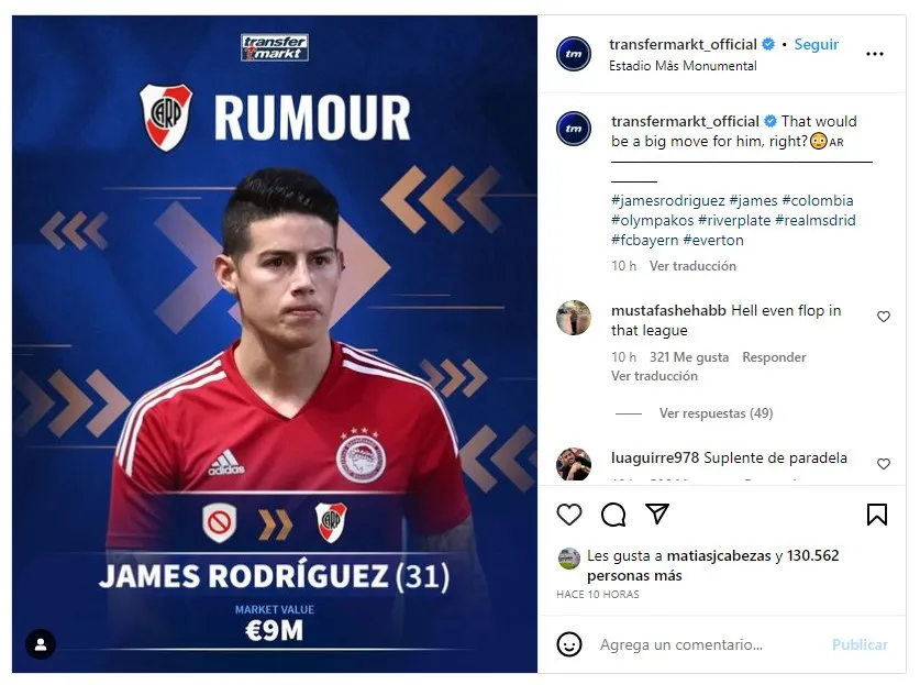 Más allá de las figuras con pasado en el club millonario que podrían pegar la vuelta, en las últimas horas surgió un nombre que podría provocar un bombazo para el fútbol argentino. Transfermarkt, sitio especializado en el mercado de pases y una de las bases de datos más importantes del mundo, sorprendió a propios y extraños con una noticia de última hora: vinculó el nombre de James Rodríguez con River Plate como posible refuerzo. El crack colombiano, que en las últimas horas quedó con el pase en su poder, podría regresar a Sudamérica y tendría varias propuestas. Una de ellas sería la del Más Grande. “Eso sería un gran movimiento para él, ¿verdad?”, adelantó el prestigioso portal en su cuenta de Instagram.