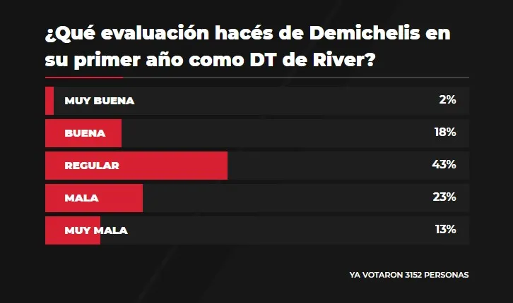 Por su parte, hay un 23% que cree que fue “mala” y un 13% que fue muy malo. Si se juntan los dos números, el 36% de los hinchas entiende que el ciclo de Demichelis hasta aquí fue negativo, contra un 20% de los simpatizantes que levantaron el pulgar, y se volcaron por las opciones “buena” y “muy buena”.