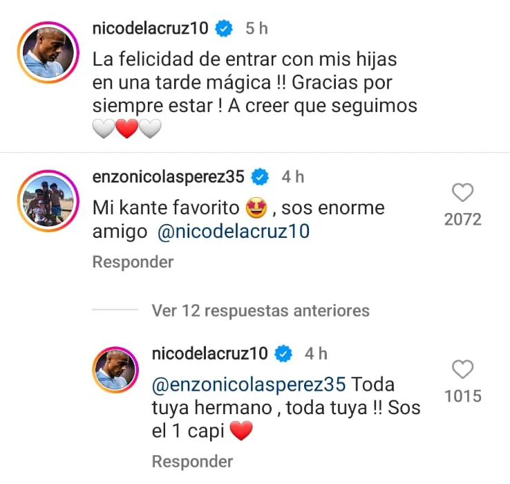 Nicolás De La Cruz compartió su felicidad en las redes sociales por haber podido entrar con sus hijas al campo de juego en la previa del Monumental. El capitán le comentó con buena onda: “Mi Kanté favorito, sos enorme amigo”. Y el talentoso mediocampista uruguayo no tardó en devolverle la pared: “Toda tuya hermano, toda tuya. Sos el 1 Capi”. Enzo le dice Kanté a De La Cruz por el parecido físico que tiene el charrúa con el volante de la Selección de Francia.