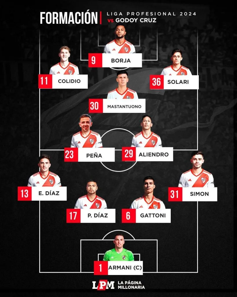 Con respecto al último encuentro ante Lanús, se meten en el equipo Franco Armani y Miguel Borja en el equipo: sale Lanzini en la mitad de la cancha para que ingrese el delantero y lógicamente Ledesma para dejarle su lugar al Pulpo.