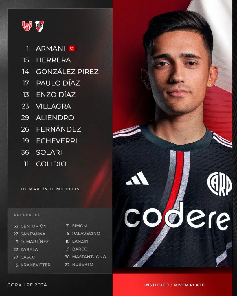 A falta de una hora para el inicio del partido, Martín Demichelis entregó la formación que pondrá el Millonario para ir en busca de la clasificación ante Instituto. ¿Los once? Franco Armani; Andrés Herrera, Leandro González Pírez, Paulo Díaz, Enzo Díaz; Ignacio Fernández, Rodrigo Villagra, Rodrigo Aliendro; Claudio Echeverri; Pablo Solari y Facundo Colidio.