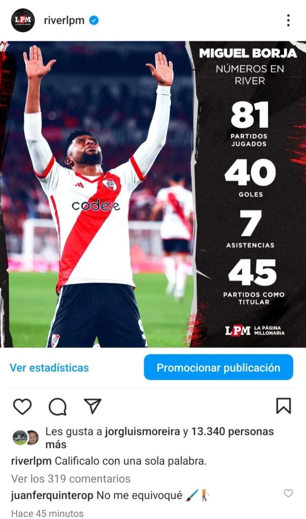 En el marco de una publicación de “La Página Millonaria” en Instagram que destacaba los extraordinarios números del delantero desde su llegada a River, Juanfer fiel a su estilo particular y desenvuelto publicó la frase “No me equivoqué”, junto a un emoji de un pincel y otro de un golfista, haciendo alusión a que en más de una ocasión ha hablado maravillas sobre él inclusive antes de su llegada a River.