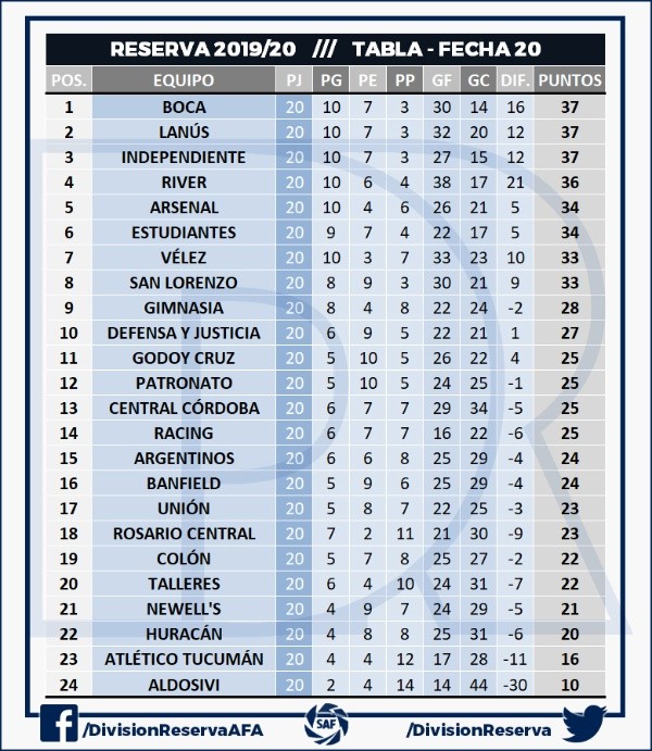¿Cómo formó la Reserva? 1-Ezequiel Centurión; 4-Franco Paredes (capitán), 2-Augusto Aguirre, 6-Tomino, 3-Angileri; 8-Santiago Simón (ST 21′ 15-Franco Alfonso), 5-Santiago Sosa, 11-Jeremías Rodríguez Puch; 10-Esteban Fernández (ST 21′ 16-Patricio Núñez); 7-Rollheiser (ST 33′ 18-Oswaldo Valencia) y 9-Girotti. Los siguientes jugadores quedaron en el banco: 12-Juan Martín Rojas, 13-Vera, 14- Casasola (ambos integraron la lista de citados por primera vez) y 17-Daniel Lucero.
