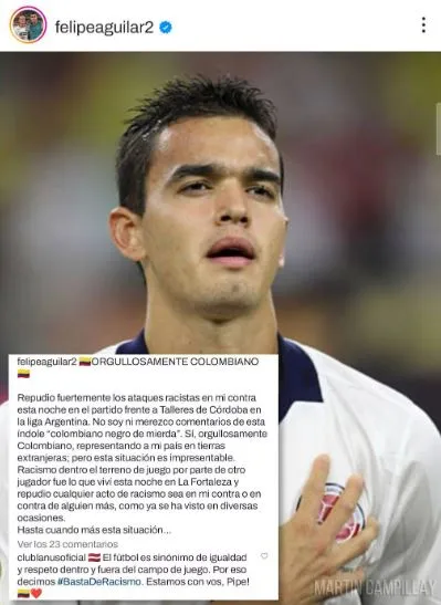 Horas después, Aguilar realizó una fuerte denuncia en redes sociales, aunque sin nombrar a nadie: “Repudio fuertemente los ataques racistas en mi contra esta noche en el partido frente a Talleres de Córdoba en la liga Argentina. No soy ni merezco comentarios de esta índole ‘colombiano negro de mierda’”.
