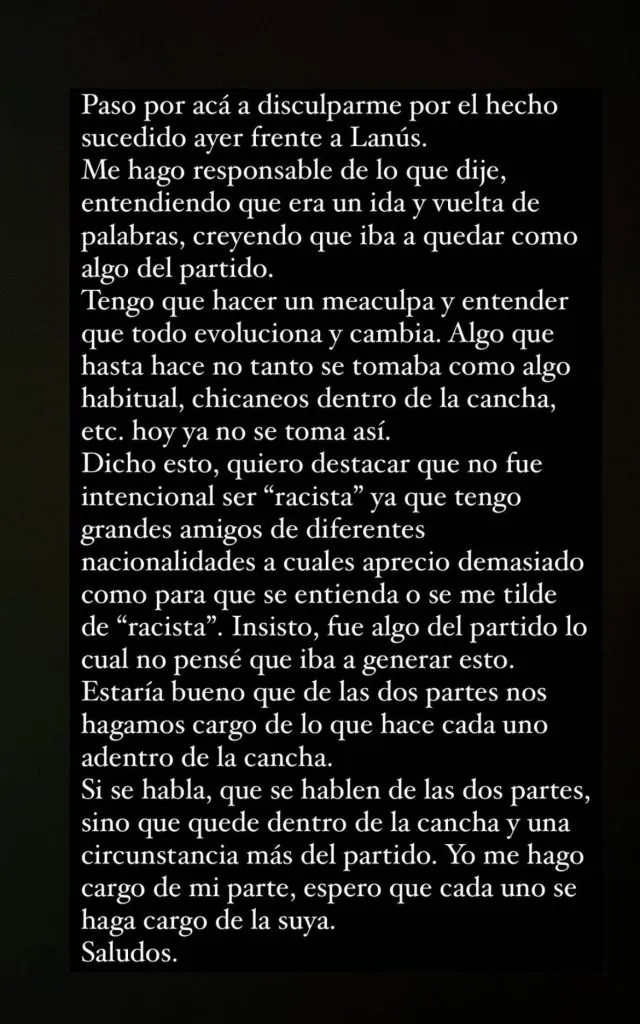 “Tengo que hacer un meaculpa y entender que todo evoluciona y cambia. Algo que hasta hace no tanto se tomaba como algo habitual, chicaneos dentro de la cancha, hoy ya no se toma así. Quiero destacar que no fue intencional ‘ser racista’ ya que tengo grandes amigos de diferentes nacionalidades“, agregó arrepentido.