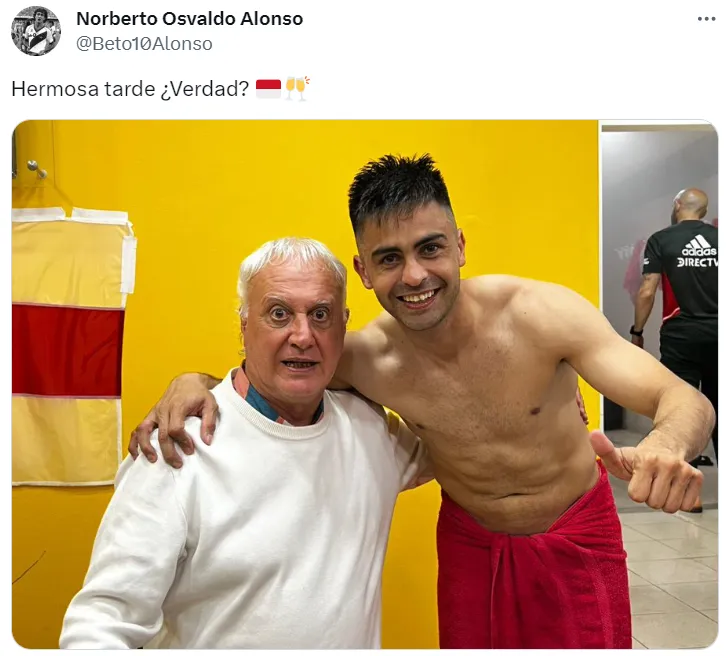 Una vez que terminó el partido, los jugadores celebraron en el campo de juego y luego se metieron en el vestuario y allí la fiesta continuó. Música, cantitos, bailes y la locura que genera ganar un superclásico. En ese vestuario también estaba Norberto Alonso, quien se sacó una foto con el Pity Martínez y aprovechó para chicanear a Boca en sus redes sociales. El Beto rememoró el famoso meme y publicó: “Hermosa tarde, ¿verdad?”.