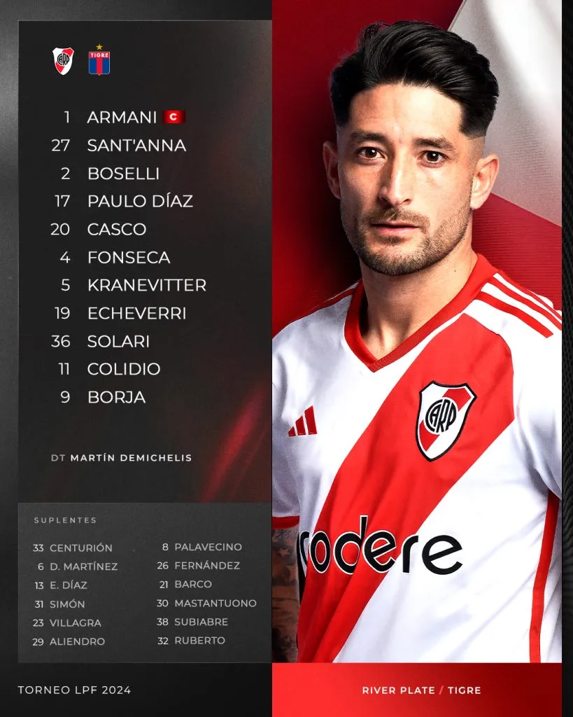 Franco Armani; Agustín Sant’Anna, Sebastián Boselli, Paulo Díaz, Milton Casco; Nicolás Fonseca, Matías Kranevitter; Claudio Echeverri, Pablo Solari; Facundo Colidio y Miguel Ángel Borja, los once elegidos por Martín Demichelis para enfrentar al Matador.