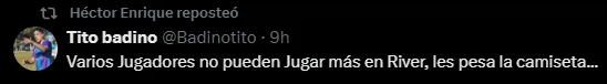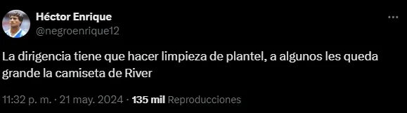 Apuntando directamente contra varios jugadores del plantel, teniendo en cuenta que varios no estuvieron a la altura ante Temperley, Héctor Enrique publicó un tuit que ya es viral: “La dirigencia tiene que hacer limpieza de plantel, a algunos les queda grande la camiseta de River”.