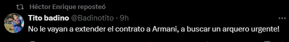 Culpando al arquero del millonario por la eliminación, el mensaje que compartió Enrique pedía una incorporación para el arco: “No le vayan a extender el contrato a Armani, a buscar un arquero urgente!“, escribió el usuario que el Negro reposteó.