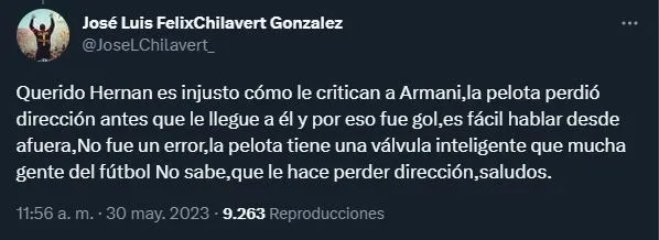 Chilavert dejó su opinión debajo del tweet de Hernán Castillo, un periodista que cubre la actualidad de River y en el cual se había armado debate sobre el presente del Pulpo. “No fue un error, la pelota tiene una válvula inteligente que mucha gente del fútbol No sabe que le hace perder dirección, saludos“, completó Chila, siempre filoso con sus respuestas.
