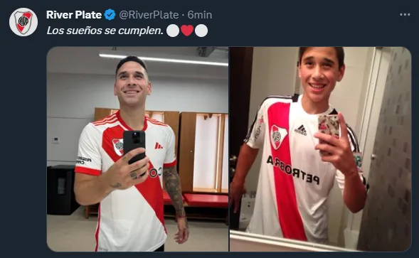 “Los sueños se cumplen“, escribió River en su cuenta oficial, adjuntando ambas imagenes. Villagra tenía varias fotos en su vieja cuenta de Facebook junto con la camiseta del Más Grande, pero la que se hizo viral fue una sola y por eso el ingenio para traerla de nuevo “a la vida” en su presentación.