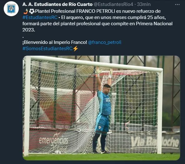 Hablamos de Franco Petroli, quien forma parte del plantel profesional hace tiempo y alterna con Reserva para sumar minutos. Con 24 años y cerca de cumplir los 25, el arquero, en consenso con Demichelis, decidió salir cedido para obtener rodaje en otro club. Su edad ya no era la adecuada para la Reserva y atajará hasta fin de año en Estudiantes de Río Cuarto.