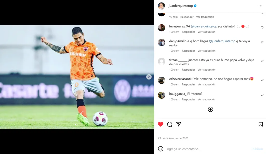 Juanfer contó que sobre el final de su vínculo con Shenzhen las cosas no estaban bien: “Tuve una experiencia magnífica, y me gustó aunque no haya terminado todo bien con el club”. Cabe recordar que la salida de Quintero de Shenzhen fue conflictiva y por eso se demoró su regreso al Más Grande.