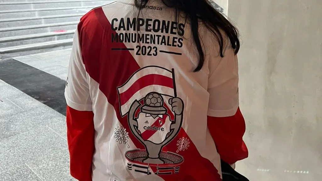 En la previa del encuentro, las autoridades de la Liga Profesional y de la Asociación del Fútbol Argentino anunciaron que esta tarde en el Monumental no iba a haber premiación para el campeón. Sin embargo, desde River se las ingeniaron para celebrar de una manera particular. Con el final del partido, comenzaron a repartir banderas de palo, gorros pilusos, paraguas y bombos con los colores del Más Grande. Y desde la utilería se preparó una camiseta para la ocasión: un estampado con la figura del trofeo en medio del Monumental, con la bandera de River, el Manto Sagrado y una leyenda que dice ‘Campeones Monumentales 2023’. Una pieza de colección que, si sale a la venta en las próximas horas, no tardará demasiado en agotarse.