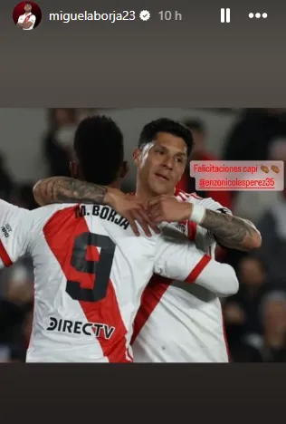 En segundo lugar, ya como una chicana directa, Miguel Borja aprovechó para mandarle un saludo a Enzo Pérez por su gran partido y subió una foto junto al ex capitán. Vale destacar que este último tuvo una noche muy especial y terminó festejando con el escudo de River en su espalda.