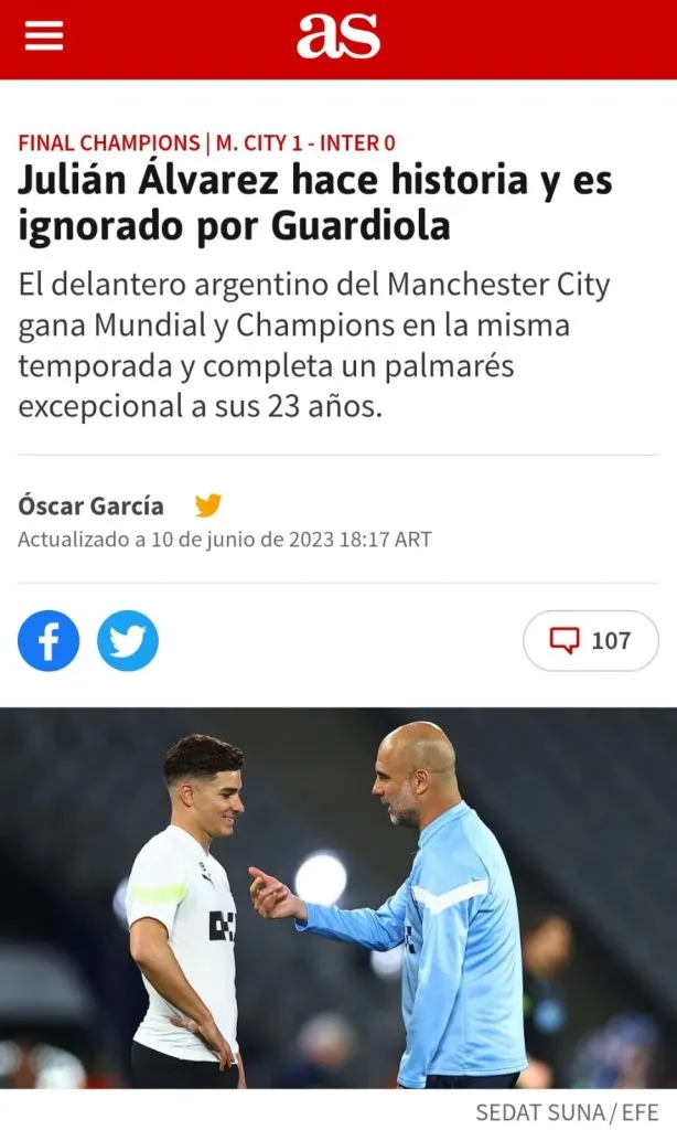 Es por esto que algunos medios españoles fueron muy críticos con Pep Guardiola, sabiendo que el trámite del juego, el flojo rendimiento de los delanteros del City a lo largo de los 90 minutos y el palmarés reciente espectacular del cordobés invitaban a que sea una decisión totalmente lógica mandarlo aunque sea algunos minutos a tratar de definir una final que al City le costó mucho, ya que logró destrabarla en la segunda mitad y luego Inter hizo méritos cuanto menos para empatar el partido.