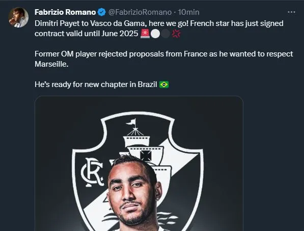 Se trata de Dimitri Payet, histórico jugador francés e ídolo del Olympique de Marsella, equipo del cual quedó libre el pasado 30 de junio. Con 35 años, el mediocampista decidió aceptar la oferta que le hizo el Vasco y así firmar un contrato hasta junio de 2025. Rompe el mercado, sin ninguna duda.