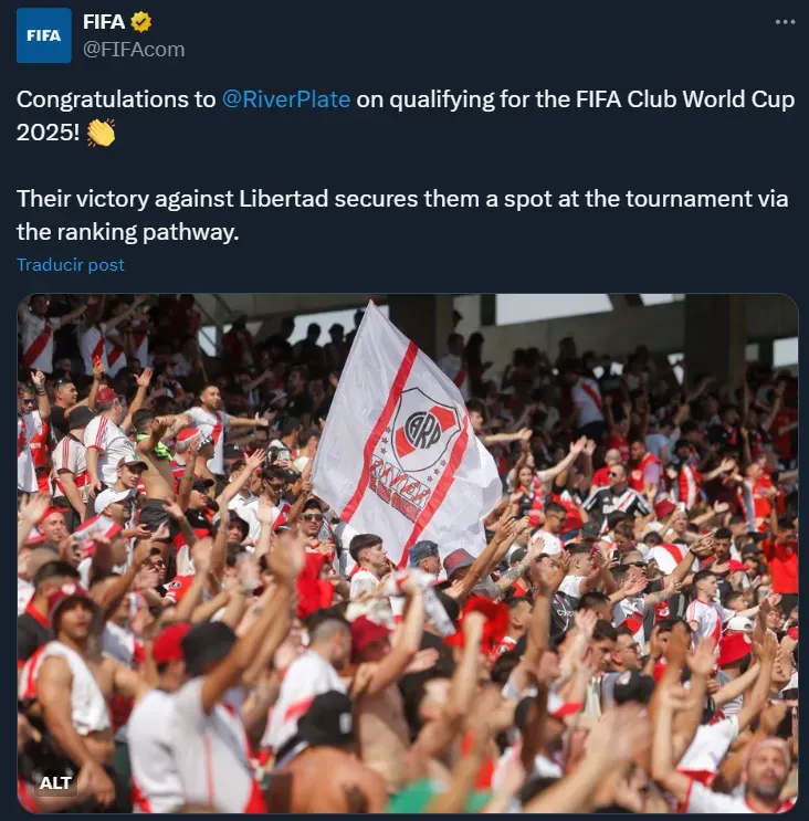 “Se viene la banda de River. Nos vemos en el Mundial de Clubes 25”, expresó la cuenta de X de la Copa Mundial de la FIFA. Por su parte, el perfil de la casa madre del fútbol mundial también se despachó con un cálido mensaje: “¡Felicitaciones a River Plate por clasificarse para la Copa Mundial de Clubes de la FIFA 2025! Su victoria contra Libertad les asegura un lugar en el torneo por la vía del ranking”.