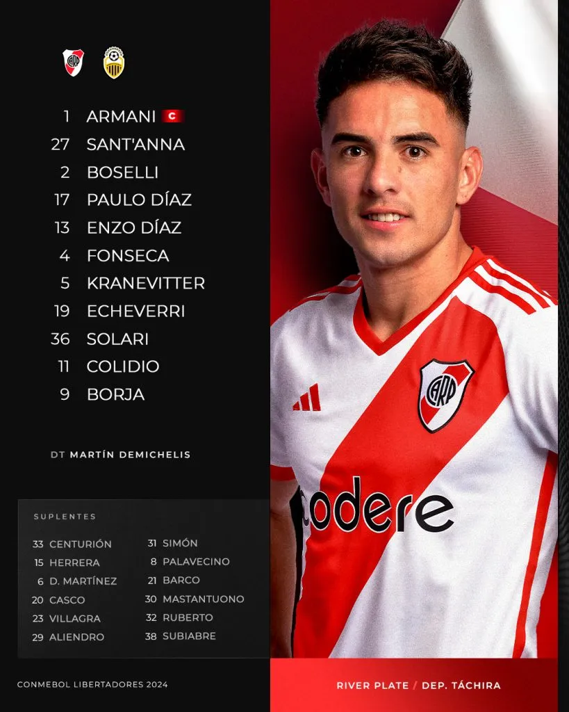 Franco Armani; Agustín Sant’Anna, Sebastián Boselli, Paulo Díaz, Enzo Díaz; Nicolás Fonseca y Matías Kranevitter; Pablo Solari, Claudio Echeverri, Facundo Colidio; Miguel Borja, los once elegidos por Demichelis para esta noche.