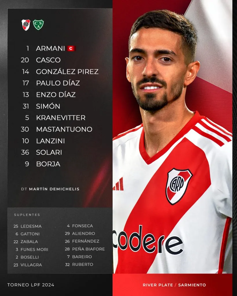 Franco Armani; Milton Casco, Leandro González Pirez, Paulo Díaz, Enzo Díaz; Santiago Simón, Matías Krannevitter, Manuel Lanzini, Franco Mastantuono; Pablo Solari y Miguel Borja, los once elegidos por Demichelis para su último partido al frente de River.