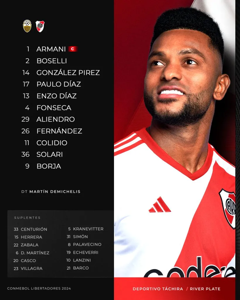 Franco Armani; Sebastián Boselli, Leandro González Pírez, Paulo Díaz, Enzo Díaz; Nicolás Fonseca, Rodrigo Aliendro; Nacho Fernández; Pablo Solari, Facundo Colidio, Miguel Borja, los once elegidos por Demichelis para jugar ante Deportivo Táchira.