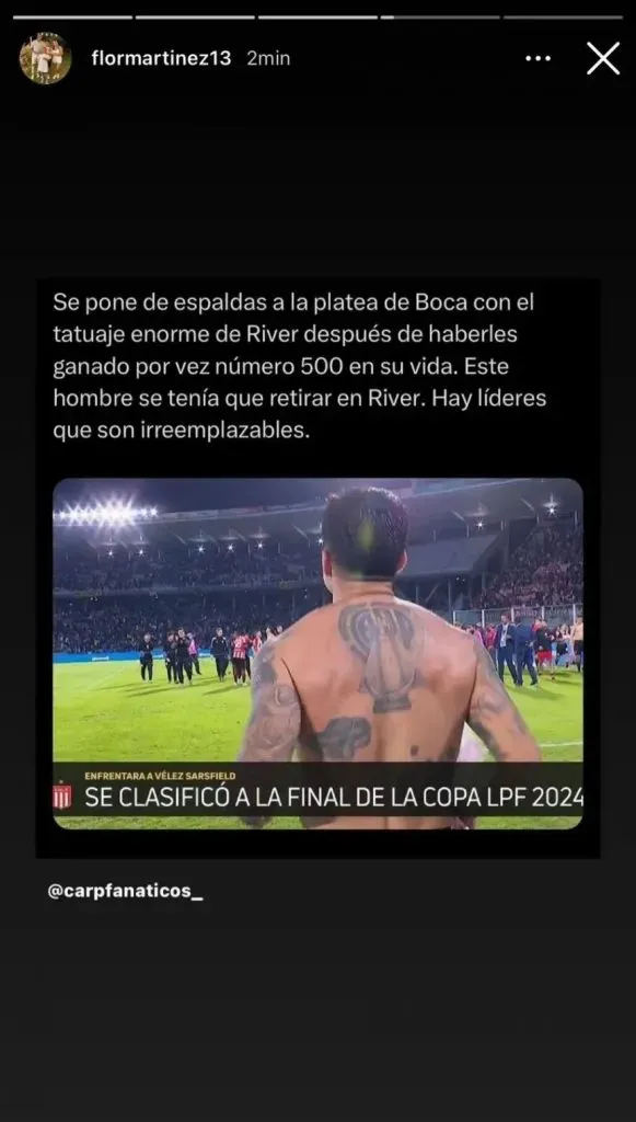 Antes de este mensaje con claros destinatarios, Florencia destacó el alocado festejo que tuvo Enzo Pérez una vez terminado el partido: “Se pone de espaldas a la platea de Boca con el tatuaje enorme de River después de haberles ganado por vez número 500 en su vida”.