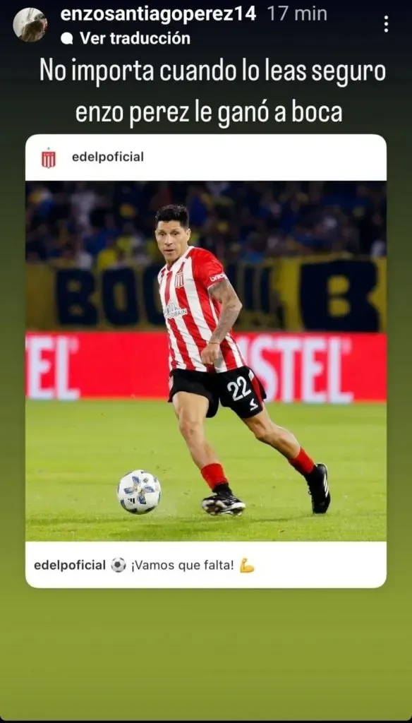Compartiendo un posteo de Estudiantes de La Plata con una foto de Enzo Pérez, el hijo del ídolo de River celebró la eliminación de Boca y ahora se concentra en apoyar a su papá en la puerta de su título número 19 como profesional.