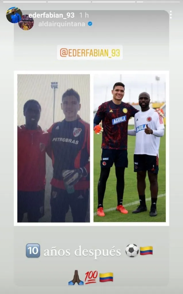 Aldair Quinta formó parte de la Selección de Colombia durante algunos años. En una de las tantas convocatorias, coincidió con su viejo amigo y excompañero Eder Álvarez Balanta. Fue en el 2021, momento en el que el arquero recordó y posteó una foto de su paso por River junto al defensor, que defendió el Manto Sagrado en 83 partido, marcó 3 goles y consiguió 2 títulos, ambos en el 2014.
