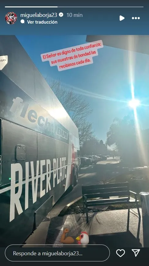 Junto al micro que trasladó al plantel, el sol y un emoji de una gallina y otro del bíceps demostrando fuerza, el colombiano utilizó este versículo de la nueva biblia para dar un mensaje de esperanza ante el mal momento que atraviesa el equipo a solo tres partidos de los octavos de final de la Copa Libertadores 2024.