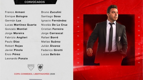 La cuenta regresiva se va acercando cada vez más. El jueves River volverá a competir después de más de seis meses sin partidos oficiales (tampoco amistosos) y Marcelo Gallardo va ajustando los últimos detalles para el viajes de este miércoles a Brasil: el técnico ya definió a los futbolistas que llevará a San Pablo. Serán 23 de los 29 que tiene inscriptos en la lista de la Copa Libertadores.