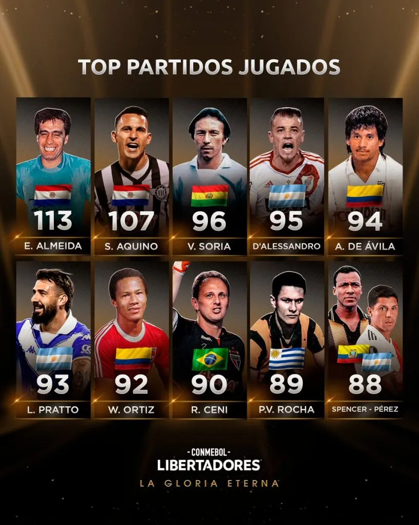 Más allá de la actuación del equipo de Martín Demichelis, hubo un protagonista que volvió a hacer historia en la Copa Libertadores. Enzo Pérez, el capitán de River, llegó a su partido número 88 en el certamen más importante del continente. Alcanzó la marca del ecuatoriano Alberto Spencer (ex Peñarol) y se metió entre los diez jugadores con más presencias en el torneo.