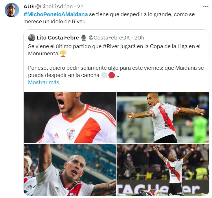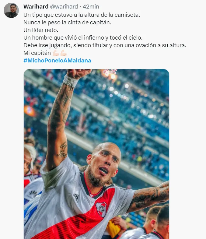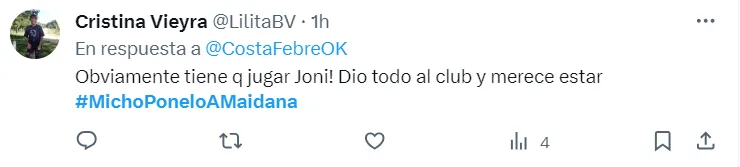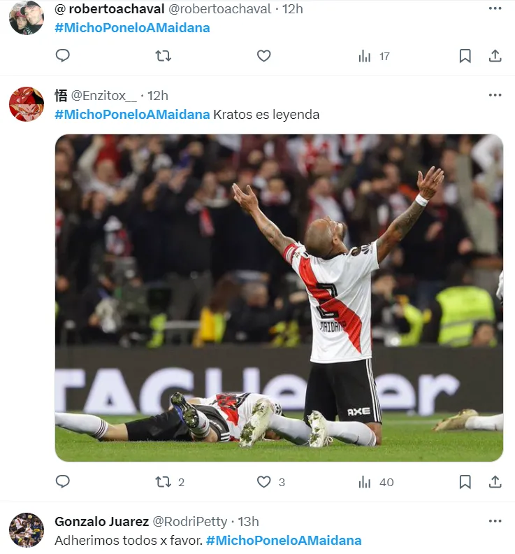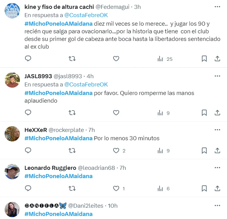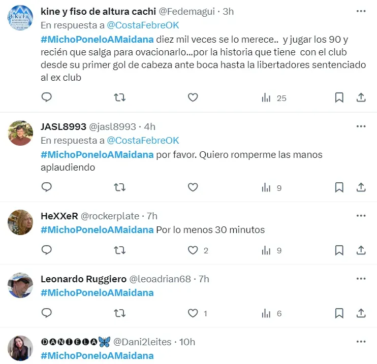 Es lógico que los hinchas quieran manifestarle a Joni todo su agradecimiento y cariño y es por eso que Lito Costa Febre, desde su cuenta de Twitter, lanzó una consigna para que los hinchas que quieran usen el #MichoPoneloAMaidana y de inmediato fueron miles los usuarios que se sumaron al pedido y lo hicieron con mensajes sumamente emotivos, reconociendo el enorme paso del Caudillo por el Más Grande.