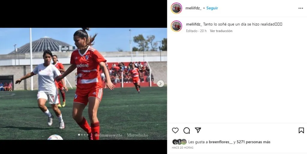 Luego de su debut con la camiseta de River en la Reserva de fútbol femenino, Melissa Fernández utilizó las redes sociales para expresar qué fue lo que sintió en su primer partido con el Manto Sagrado: “Tanto lo soñé que un día se hizo realidad”, publicó la novia del Diablito en su cuenta de Instagram.