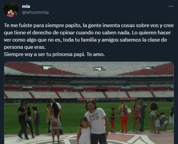 “Te voy a amar toda la vida, pa”, fue la frase que eligió usar Mía Serrano en sus redes sociales para darle un último adiós a su papá, seguido de una foto de ambos de hace algunos años. Quienes también lo despidieron fueron sus amigos de la Filial River de Morón, precisamente “Los Pibes del 20”, el grupo al que pertenecía y con el que compartía asados, juntadas y tardes de cancha.