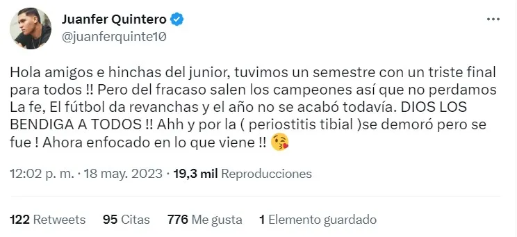 “Hola amigos e hinchas del Junior, tuvimos un semestre con un triste final para todos!! Pero del fracaso salen los campeones así que no perdamos la fe. El fútbol da revanchas y el año no se acabó todavía. DIOS LOS BENDIGA A TODOS!! Ahh y por la periostitis tibial se demoró pero se fue! Ahora enfocado en lo que viene!!”, escribió Juanfer en su cuenta de Twitter.
